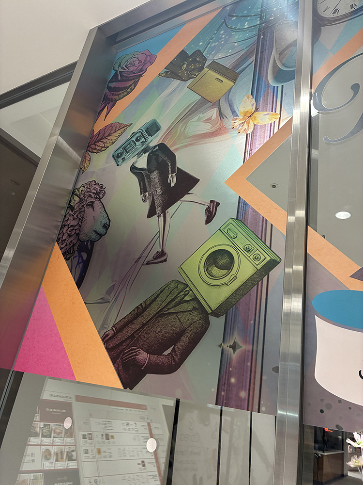 柱巻き装飾、ガラス面装飾、床装飾、エレベーター扉ラッピングなど